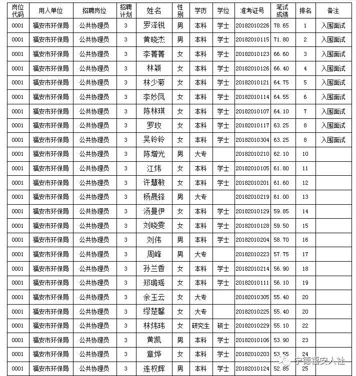 经过笔试后按照比例共17人成绩合格入围面试,请以下入围面试人员于6月5日至6月6日携带本人身份证、户口簿、毕业证书(学历证明)的原件及复印件到福安市人力资源和社会保障局人才办(福安市棠兴路806号行政服务中心9楼918室)进行资格复核,公示电话:0593-8988550,公示时间:6月4日至6月8日。