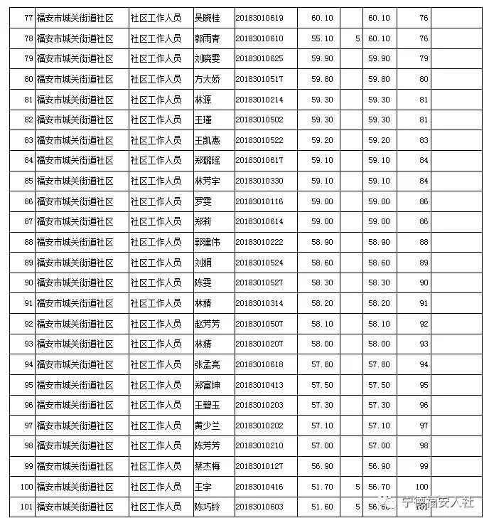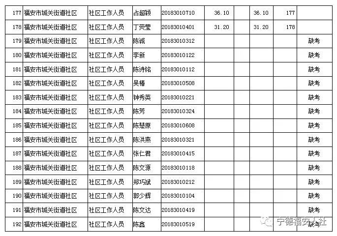2018年宁德福安市面向社会公开招聘社区工作人员成绩公示