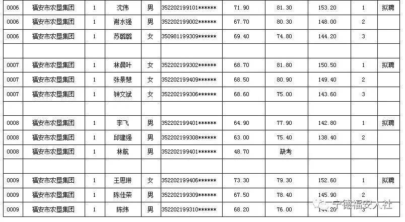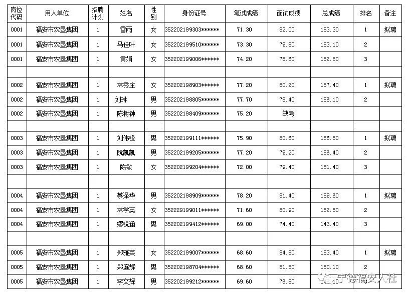 2018年福安农垦集团面向社会公开招聘工作人员笔试面试均已完成,现将成绩及排名公示如下,