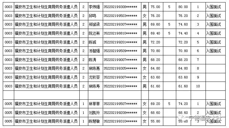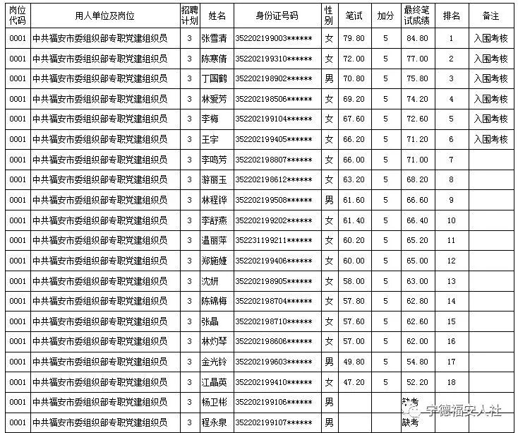 福安市专职党建组织员和卫计局劳务派遣人员公开招聘笔试成绩及排名公