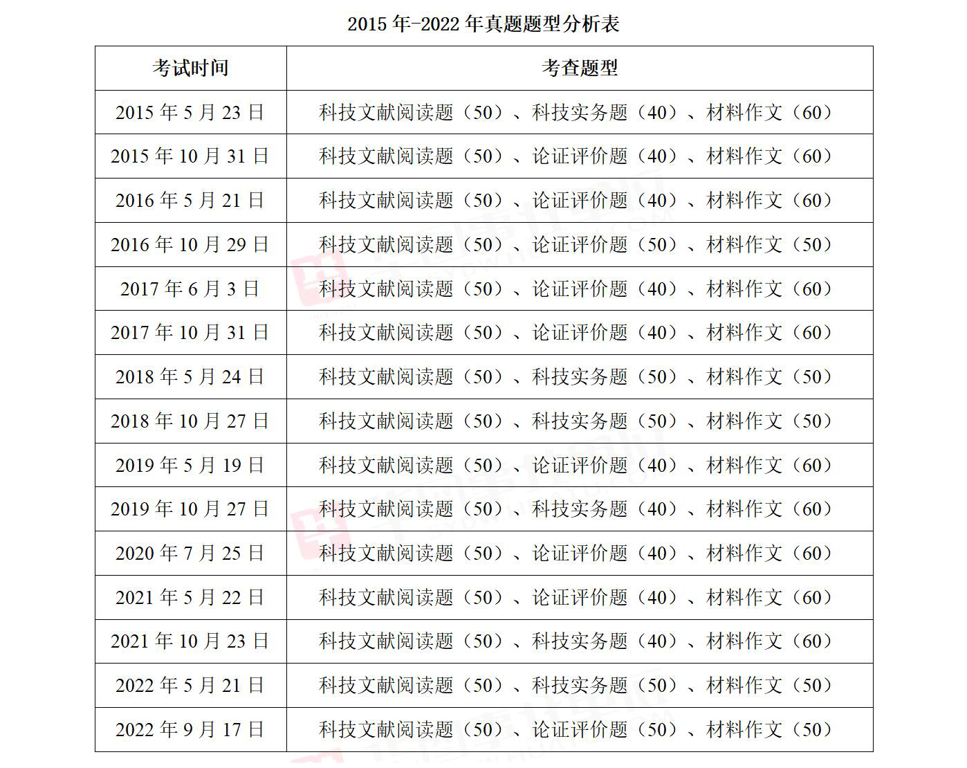 从考过的真题来看, C 类考试历次都是由 3 道大题组成, 从分值的分配情况来看, 科技文献 阅读题分值 50 分保持稳定; 论证评价题在 40 分或 50 分之间变动; 科技实务题 40 分或者 50 分; 材料作文题在 50 分与 60 分之间变动。 一般第一题都是科技文献阅读题, 此题可以说也是综合应 用 C 类考试的必考题型。