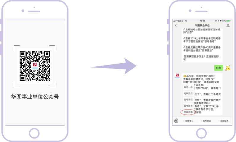 1、扫码关注华图事业单位公众号 2、点击【时政周播】进入开始学习